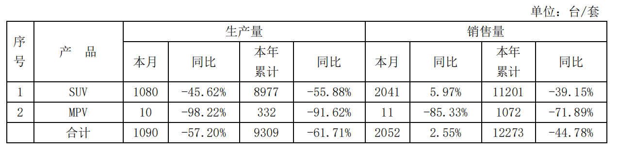 总体来看,11月海马汽车总生产量为1090台,同比减少57.2%;今年累计产量为9309台,同比减少61.71%。11月总销售量为2052台,同比增加2.55%;今年累计销量为12273台,同比减少44.78%。