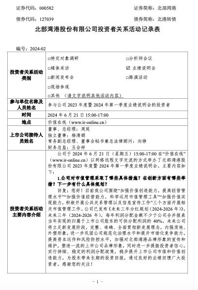北部湾港股份有限公司(以下简称“北部湾港”或“公司”)6月24日发布公告称,公司于6月21日召开了2023年度暨2024年第一季度业绩说明会。在会议上,北部湾港透露,截至2023年12月31日,北部湾港集团尚有7个沿海货运泊位未注入上市公司。根据北部湾港集团关于避免同业竞争的承诺,相关泊位将在条件成熟后通过最适合的方式注入上市公司。