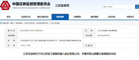 2月25日,江苏证监局发布行政监管措施决定书,对江苏哈工智能机器人股份有限公司(*ST工智,以下简称“公司”)及其时任董事长乔徽因会计核算不准确、信息披露违规行为采取出具警示函并计入证券期货市场诚信档案的监管措施。