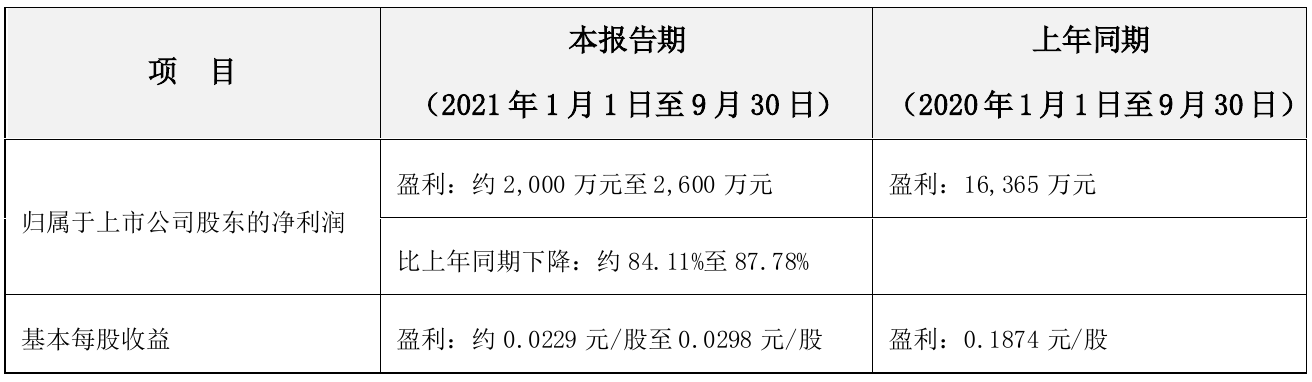 挖贝网10月14日,*ST东电(000585)近日发布2021年前三季度业绩预告公告,预计2021年前三季度实现归属于上市公司股东的净利润为2000万元–2600万元,比上年同期减少84.11%–87.78%。