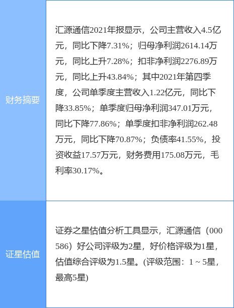汇源通信公告,报告期内,公司实现营业收入4.50亿元,同比下降7.31%;归属于上市公司股东的净利润2614.14万元,同比增长7.28%。基本每股收益0.1351元。
