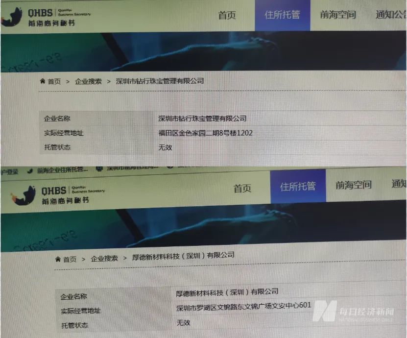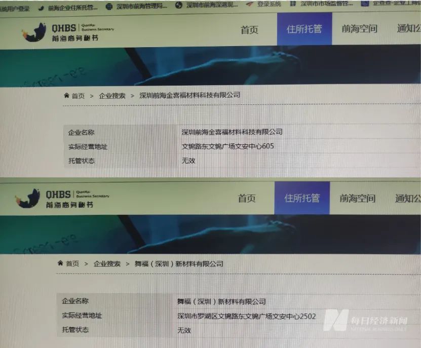 不过,记者在未透露身份的情况下,通过前海商务秘书公司工作人员查询了解到,深圳舞褔和深圳金喜福的“托管状态”均为“无效”。