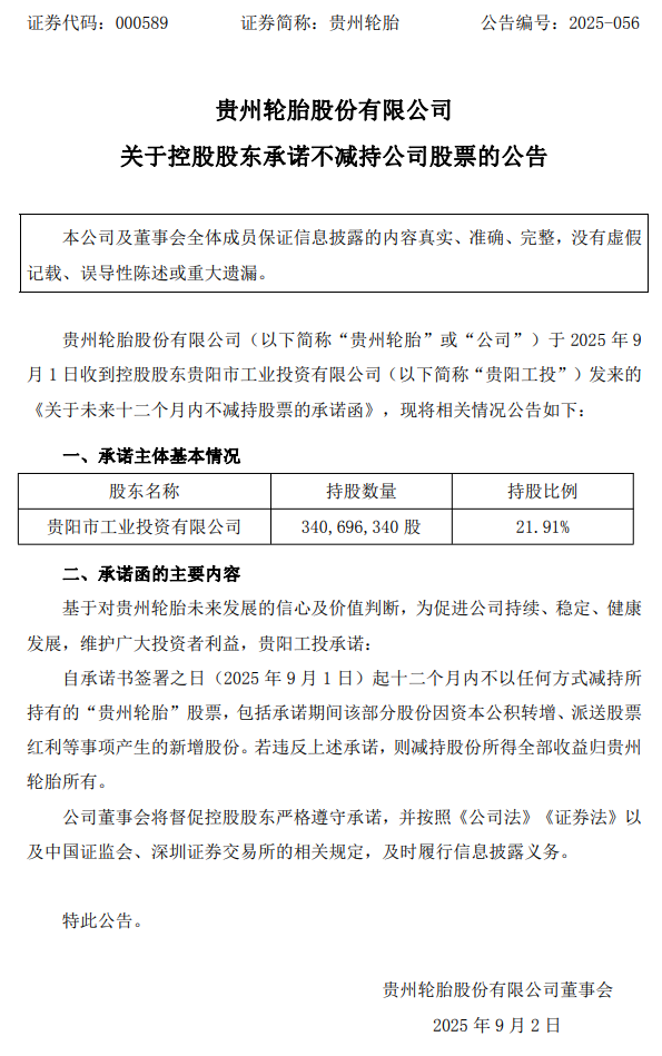 2025年9月1日,A股市场迎来一则积极的信号。老牌轮胎企业——贵州轮胎(000589)发布公告,宣布其控股股东贵阳市工业投资有限公司(以下简称“贵阳工投”)承诺,在未来十二个月内,不以任何方式减持所持有的公司股份。这一承诺涉及高达21.91%的股权,无疑为市场注入了一剂强心针,其背后传递的不仅是维护股价稳定的短期意图,更是对公司未来发展潜力的深度认可和长期信心的坚定表达。