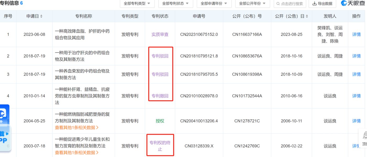 据天眼查显示,名实药业共6件发明专利,其中1项被终止、1项为授权、3项被驳回、1项审查中。另外,最新一项发明专利申请时间为2023年6月8日,而距离上一次申请时间2018年7月19日已经过去5年。