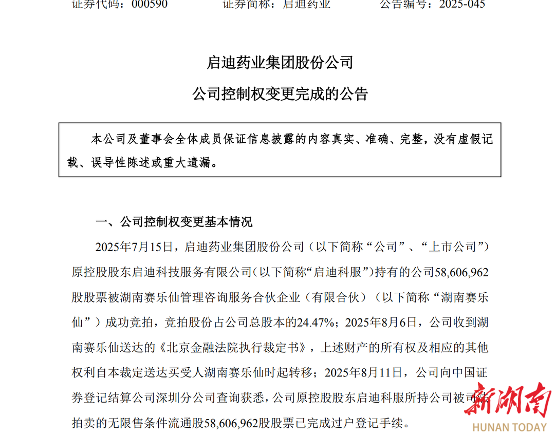 备受资本市场关注的启迪药业(000590)控股权变更落地。9月23日晚,启迪药业发布公告称,公司控股权变更已顺利完成,新的控股股东为湖南赛乐仙管理咨询服务合伙企业(有限合伙),实际控制人为恒昌医药创始人兼董事长江琎。