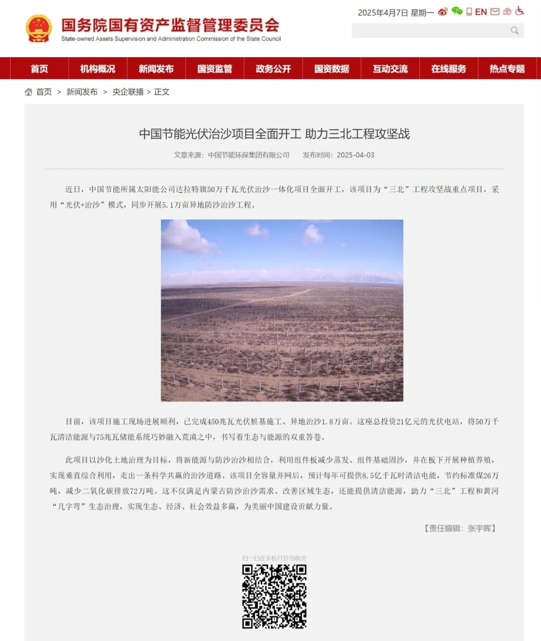 4月3日,国务院国资委官网报道了中节能太阳能达拉特旗50万千瓦防沙治沙光伏一体化项目全面开工建设。该项目为“三北”工程攻坚战重点项目,采用“光伏+治沙”模式,同步开展5.1万亩异地防沙治沙工程。