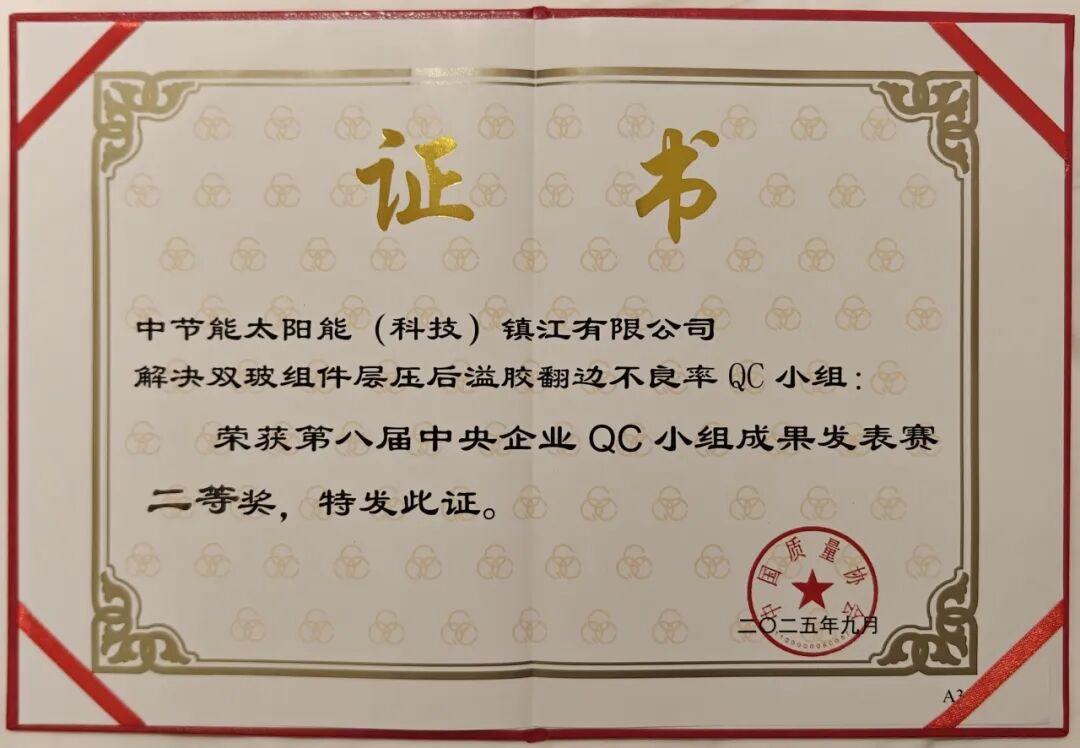 近日,由国务院国资委指导、中国质量协会主办的第八届中央企业QC小组成果发表赛圆满落幕。太阳能镇江公司“解决双玻组件层压后溢胶翻边不良率小组”凭借“降低溢胶翻边不良率”项目的创新成果和出色的现场展示,从众多参赛队伍中脱颖而出,荣获第八届中央企业QC小组成果发表赛二等奖。