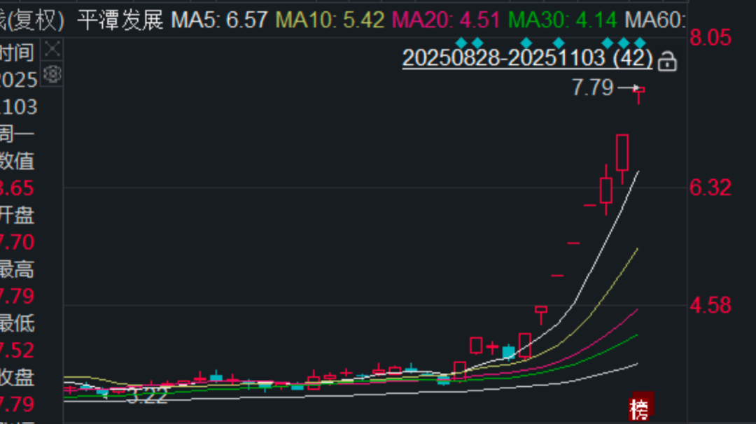 截至11月3日,平潭发展股价报收7.79元/股,当日涨幅为10.03%。从10月23日至11月3日,公司股价收获了7个涨停板。
