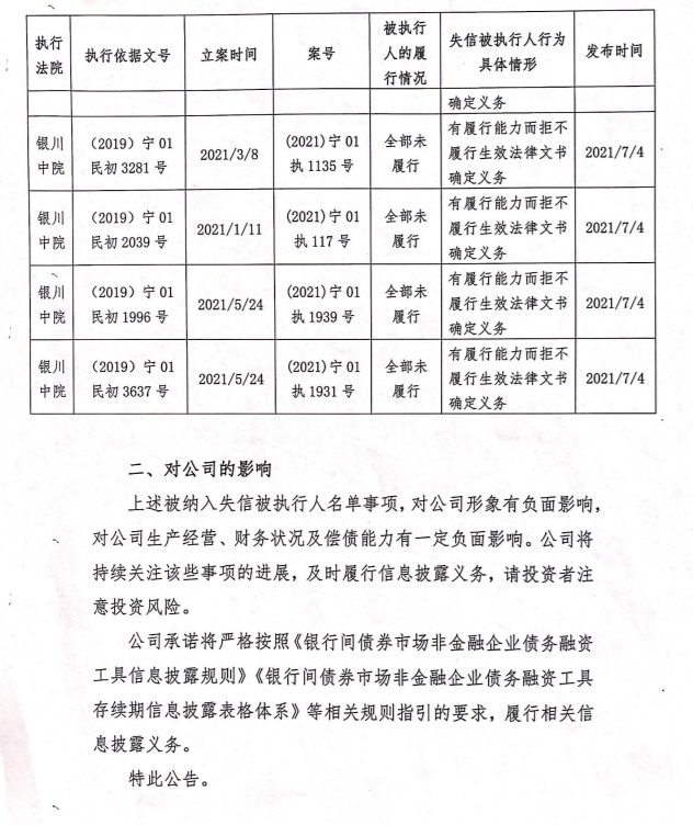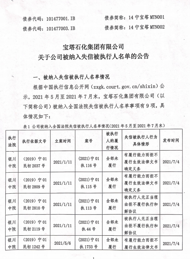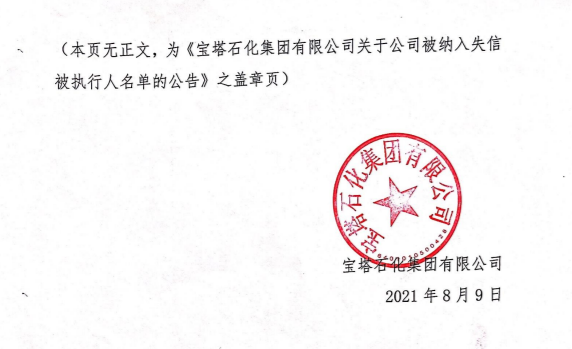宝塔石化集团有限公司发布公告称,2021年5月至7月末,公司被纳入全国法院失信被执行人名单事项有9项。该事项对公司形象有负面影响,对公司生产经营、财务状况及偿债能力也有一定负面影响。公司将持续关注该事项进展,并及时履行信息披露义务。
