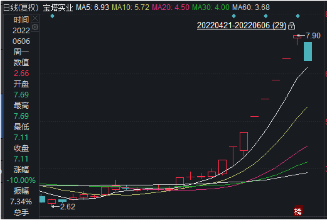 从5月24日至6月2日,宝塔实业连续出现8个涨停,6月6日却在开盘两分钟内死死封住跌停,让投资者毫无离场的机会。