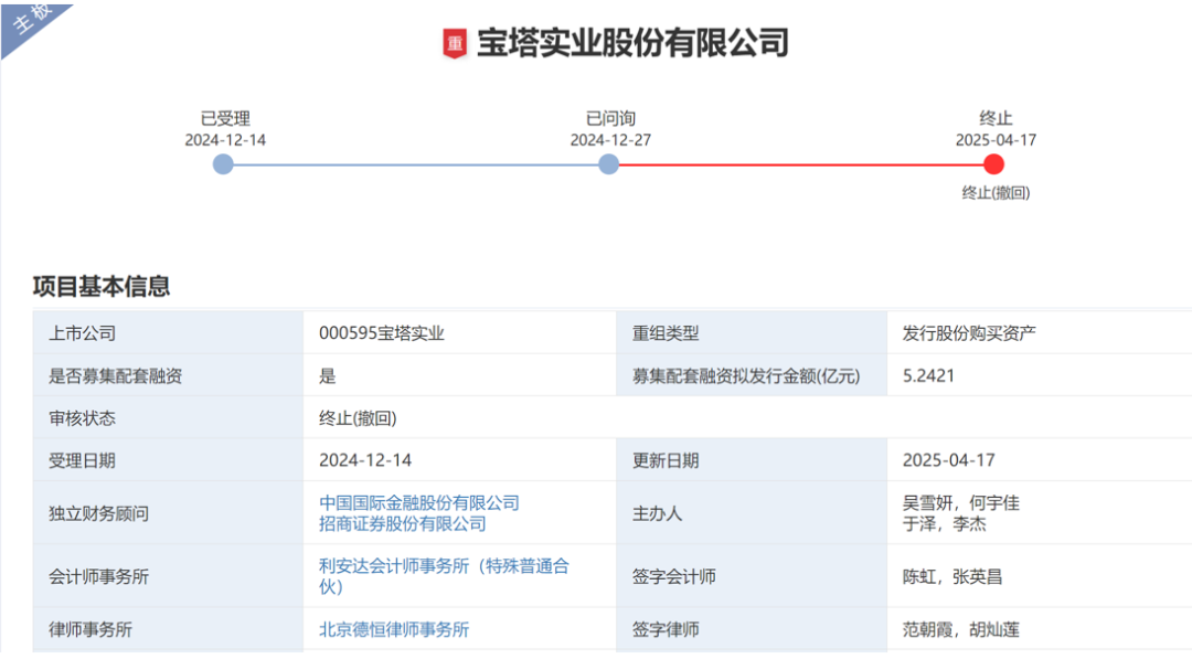 1.4月18日,深交所公告了上市公司宝塔实业终止重大资产重组的消息。这个重组自申报到上市公司主动撤回只用了4个月的时间,具体情况如下: