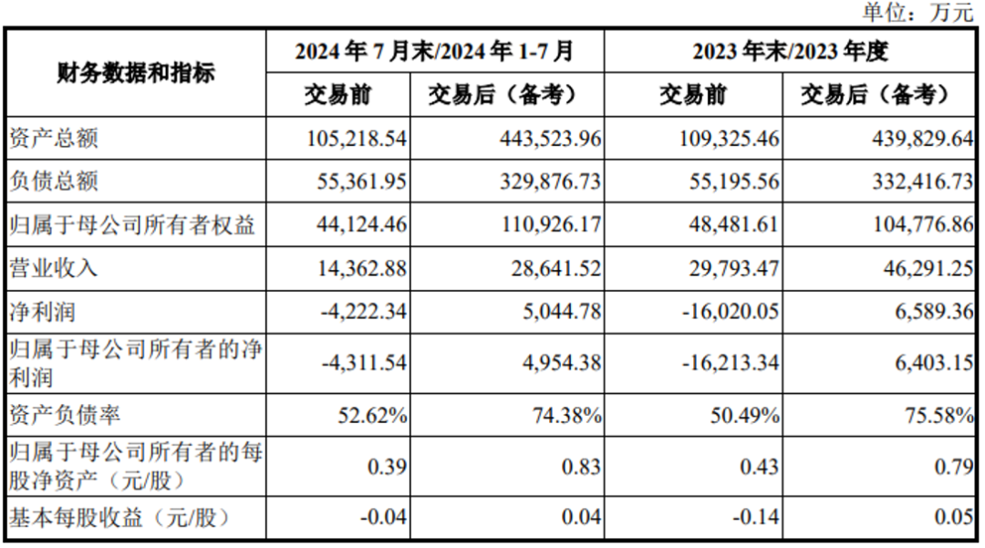根据上市公司2023年度审计报告、2024年1-7月财务数据(未经审计),《财务报告更正专项审核报告》《备考审阅报告》,在不考虑募集配套资金的情况下,上市公司本次交易前后财务数据如下: