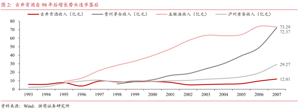 1998年开始,由于盲目多元化、管理层腐败等一系列失误,古井贡酒错失了白酒行业的黄金十年,并由全国性酒企退居区域性酒企,营收大幅落后于五粮液和贵州茅台等对手。另外,由于公司早期采取了“降度降价”的策略,古井贡酒没有及时跟上白酒高端化的发展趋势,并一定程度上影响了品牌形象。