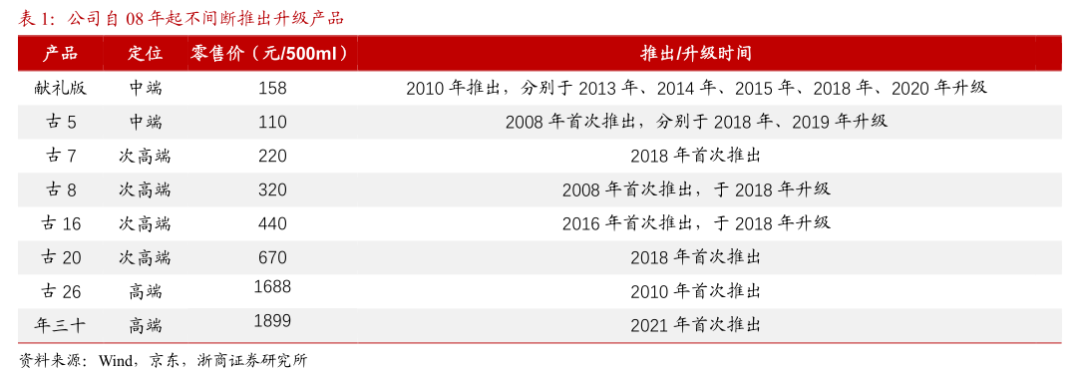 2008年开始,古井贡酒在新任管理层的带领下全面停止多元化,重新聚焦白酒主业。2008年,古井贡酒发力中高端战线,推出拳头产品年份原浆系列,年份原浆古5、古8系列相继问世。与此同时,古井贡酒在销售渠道方面全面实施“三通工程”,通过精细化的销售渠道抓住省内白酒市场消费升级的契机,逐渐坐稳了徽酒老大的位子。