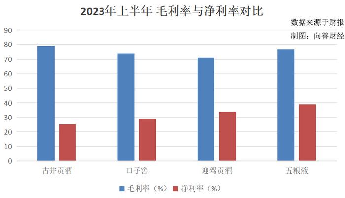 但销售费用的居高不下,也使得毛利率高于五粮液(76.78%)的古井贡酒(78.88%),在净利率表现却又处于行业中下游水平,同期仅为25.15%,不仅与五粮液的39.1%差距较大,甚至还低于其省内竞品迎驾贡酒和口子窖,这两家酒企同期的净利率均在30%左右。