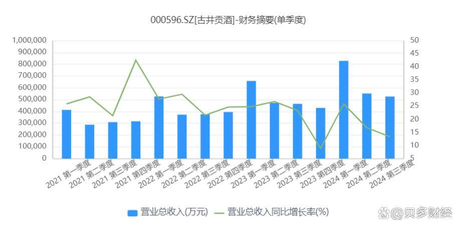 细看古井贡酒2024年的季度财务报告,可以看到一个高开低走的趋势,先是第一季度营收增长25.85%,净利润增长31.61%;而后第二季度营收增速显著下降至16.8%,净利润增速为24.6%;第三季度两项指标更是进一步降至13.4%和13.6%。