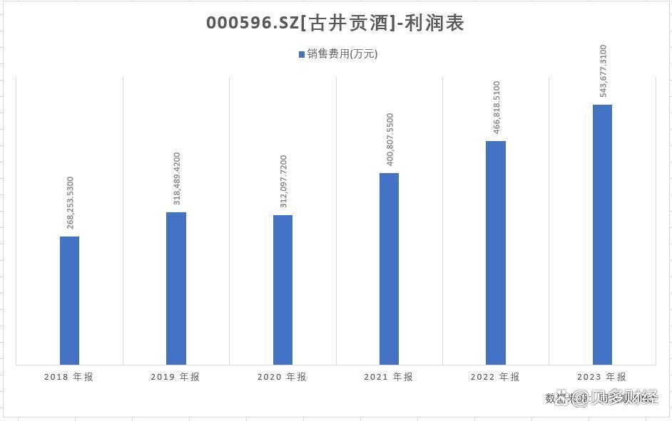 根据古井贡酒财务数据显示,2018年到2023年,古井贡酒销售费用分别为26.83亿元、31.85亿元、31.21亿元、40.08亿元、46.68亿元、54.37亿元,占营业收入的比例分别为30.88%、30.57%、30.32%、30.20%、27.93%、26.84%。