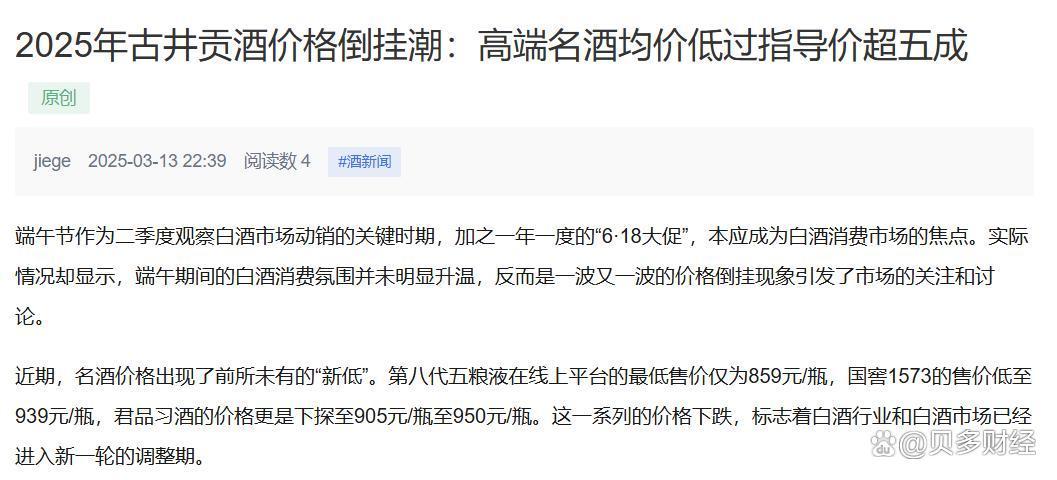 这种集体下行的表现首先是高端酒价格带失守,以茅台、五粮液为代表的千元价格带产品普遍价格倒挂。例如飞天茅台批发价从2024年年初的2680元/瓶跌至2290元/瓶,跌幅达15%