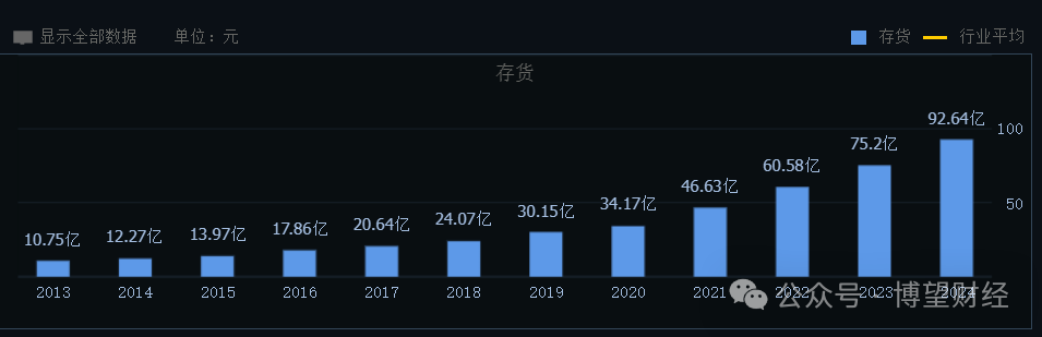 截至2024年末,古井贡酒的存货账面价值达92.64亿元,同比增长23.2%,高于行业平均水平。