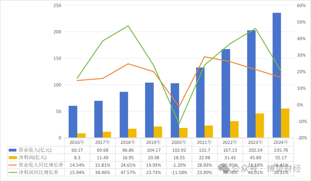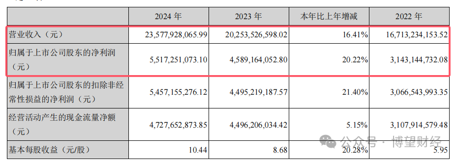 财报显示,古井贡酒2024年实现营业总收入235.78亿元,同比增长16.41%;归属于上市公司股东的净利润55.17亿元,同比增长20.22%。