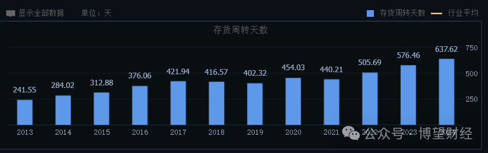 截至2024年末,古井贡酒的存货账面价值达92.64亿元,同比增长23.2%,高于行业平均水平。存货周转天数由2023年的576.46天增加至638.68天。