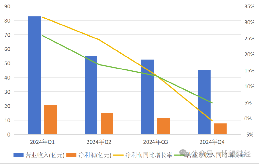 2025年一季报显示,古井贡酒实现营业收入91.46亿元,同比增长10.38%;净利润为23.3亿元,同比增长12.78%。2024年同期公司的营收和净利润增速分别为25.85%、31.61%。可见,失速特征较为明显。