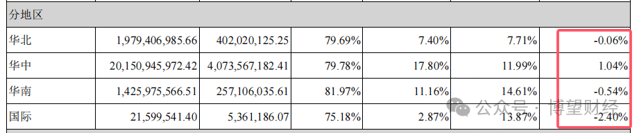 此外,古井贡酒不仅在省外市场拓展方面表现乏力,还遭遇了地区毛利率下滑的困境。2024年,除华中地区外,华北、华南及国际区域的毛利率均出现下滑,降幅分别为0.06%、0.54%、2.40%。