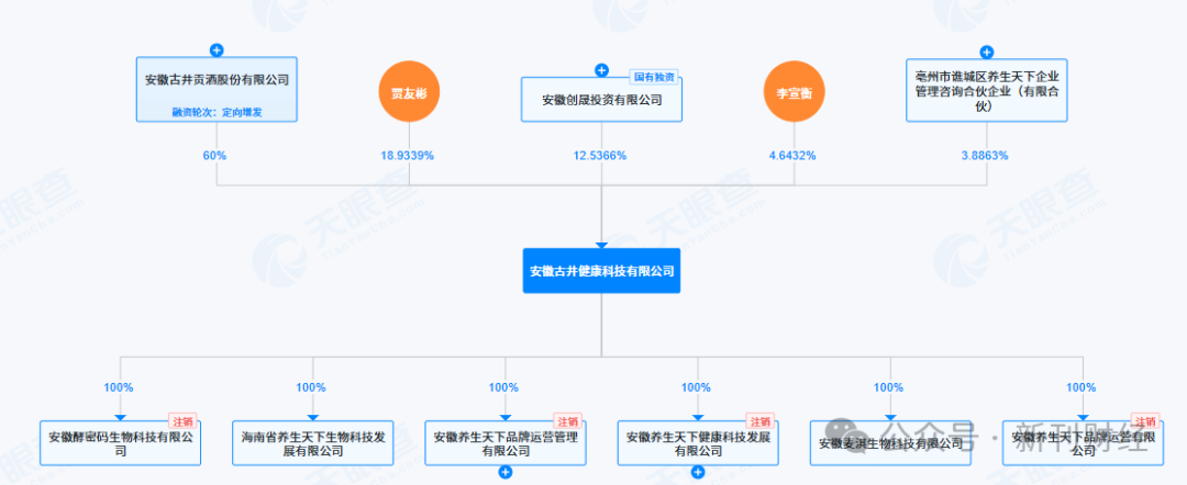 除古井贡酒控股60%外,古井健康公司其余股东包括:贾友彬(18.93%)、安徽创晟投资(12.54%)、李宣衡(4.64%)及亳州谯城区养生天下合伙企业(3.89%)。值得关注的是,公司旗下6家子公司中已有4家注销,目前仅剩海南养生天下生物科技和安徽麦淇生物科技两家处于存续状态,部分注销企业存在司法案件,或反映出其业务布局结构存在一定经营风险。