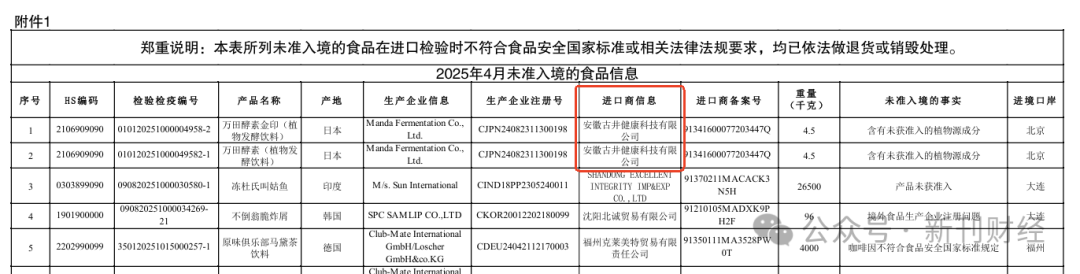 2025年6月5日,半岛网报道显示,古井贡酒(000596.SZ)旗下子公司安徽古井健康科技有限公司(以下简称:古井健康)从日本进口的两款酵素产品未准入境。5月22日,中国海关总署发布了2025年04月全国未准入境食品信息,内容显示,古井健康进口的“万田酵素金印”和“万田酵素”(生产企业:日本万田发酵株式会社Manda Fermentation Co.,Ltd.)因含有我国未批准使用的植物源成分,未能通过入境检验。