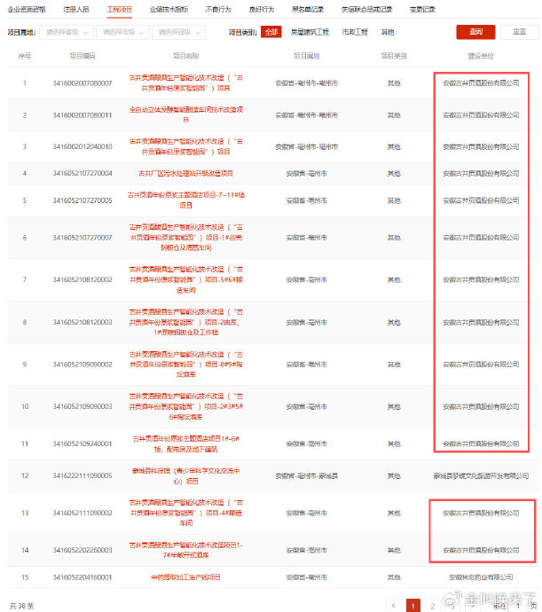 据全国建筑市场监管公共服务平台的数据,臻瑞建设的38个工程项目,有35个的“建设单位”都是古井贡酒,包括古井贡酒酿酒生产智能化技术改造(“古井贡酒年份原浆智能园”)项目等。