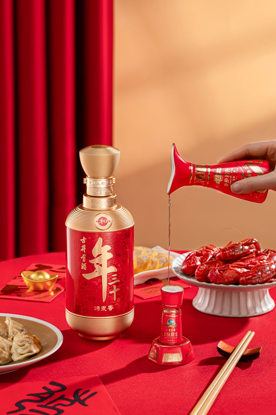 “产品定位主要面向大众百姓,适用于春节等传统佳节。”这款酒的设计从命名开始就直指春节仪式感的核心时刻——年三十。瓶身采用经典的“灯笼瓶”造型,线条圆润饱满,象征阖家团圆;瓶身模印剪纸风格的灯笼、鞭炮、红包、元宝等吉祥图案,举杯之间,年味自生。