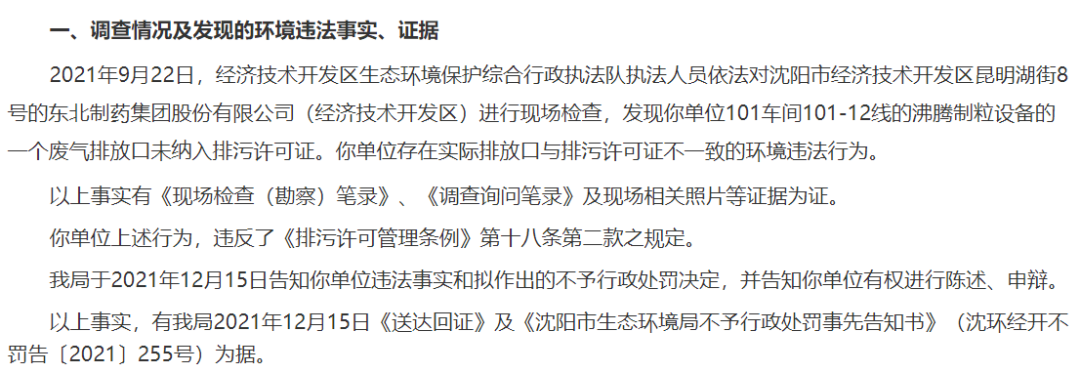 环保部门近期发布的公告显示,2021年9月22日,沈阳经济技术开发区生态环境保护综合行政执法队执法人员依法对沈阳市经济技术开发区昆明湖街8号的东北制药进行现场检查,发现公司101车间101-12线的沸腾制粒设备的一个废气排放口未纳入排污许可证。东北制药存在实际排放口与排污许可证不一致的环境违法行为。