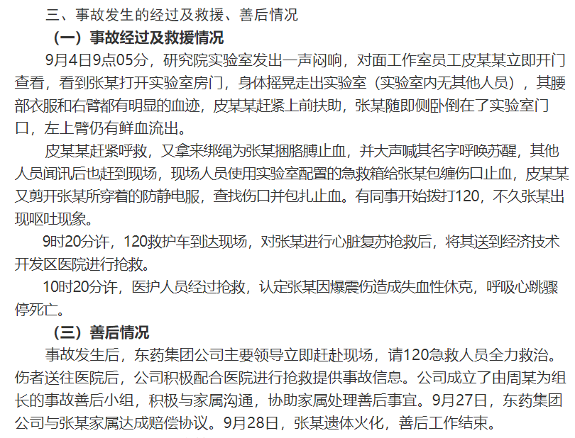 据该局披露,死者张某是东北制药研究院实验室研发员,从事药品研发工作十余年。事故原因是杂质合成试验过滤液中存在的未知成分瞬间释放能量,引起过滤液爆炸,造成抽滤瓶碎裂,玻璃碎片造成张某左腿股动脉损伤,引起出血性休克,导致张某死亡。