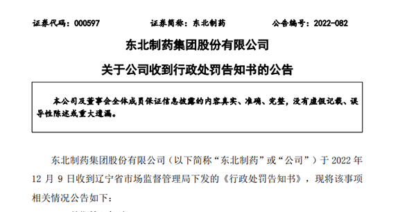 中国网财经12月13日讯昨日晚间,东北制药集团股份有限公司(“东北制药”000597.SZ)发布公告称,公司12月9日收到辽宁省市场监督管理局下发的《行政处罚告知书》,因违反反垄断法被处以罚款1.33亿元。