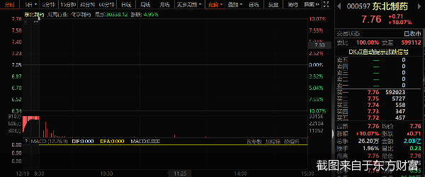 交易行情显示,12月19日,东北制药开盘冲上涨停,截至收盘一直维持涨停状态,报涨停价7.76元/股,涨幅为10.07%,总市值为111.3亿元。公司全天成交金额为2.03亿元,换手率为1.96%,截至收盘买一位置封单逾59万手。