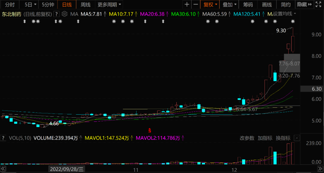 12月13日、14日,东北制药股价连续涨停;15日来了个准跌停;19日、20日,东北制药再度涨停;21日,东北制药全天高位震荡,收盘上涨超过4%,并出现21.3亿元的单日最大成交额。