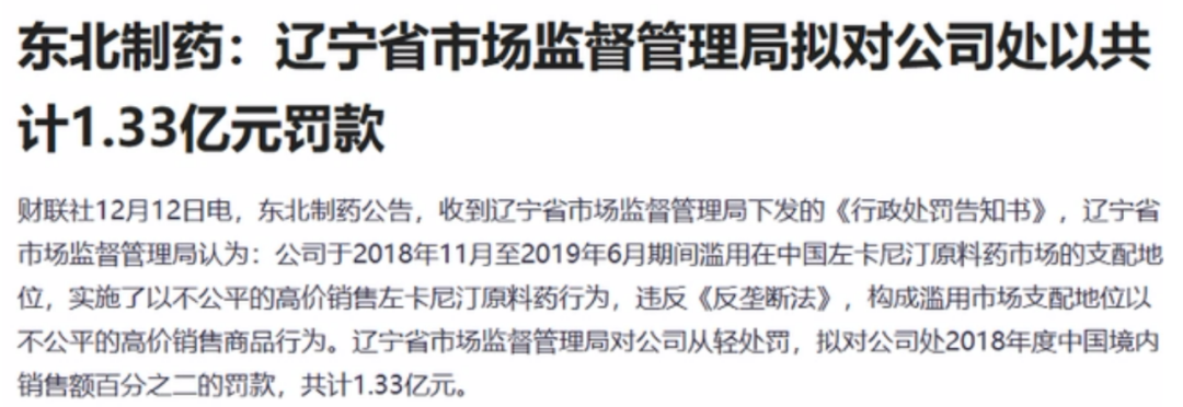 值得注意的是,东北制药虽然因为“低价良心药”大热,但公司12月12日却因为“2018年11月至2019年6月期间,滥用在中国左卡尼汀原料药市场的支配地位,实施了以不公平的高价销售左卡尼汀原料药行为”,被辽宁省市场监管局罚款1.33亿元。