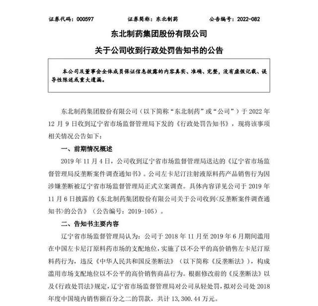 12月12日,东北制药公告收到《行政处罚告知书》,辽宁省市场监督管理局认为,公司于2018年11月至2019年6月期间滥用在中国左卡尼汀原料药市场的支配地位,实施了以不公平的高价销售左卡尼汀原料药行为,违反《反垄断法》,构成滥用市场支配地位以不公平的高价销售商品行为,因此被罚共计1.33亿元。