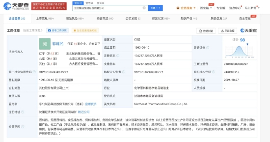 东北制药集团股份有限公司成立于1993年6月,法定代表人、董事长为郭建民,注册资本约13.5亿人民币,经营范围含原料药、无菌原料药、食品添加剂、饲料添加剂、危险化学品制造,液体消毒剂制造和销售等,由江西方大钢铁集团有限公司、辽宁方大集团实业有限公司、方威、武恩波等共同持股。