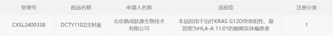 今日(8月9日),中国国家药监局(NMPA)药品审评中心(CDE)官网公示,鼎成肽源生物申报的1类创新药获批临床,拟用于治疗KRAS G12D突变阳性、基因型为HLA-A 11:01的晚期实体瘤患者。根据鼎成肽源生物早先新闻稿介绍,DCTY1102注射液为一款靶向HLA-A*11:01基因型、KRAS G12D突变的TCR-T细胞治疗产品,适应症为晚期胰腺癌、结直肠癌等恶性实体肿瘤。值得注意的是,几天前(8月6日),东北制药集团股份有限公司(东北制药)宣布拟收购鼎成肽源70%的股权。