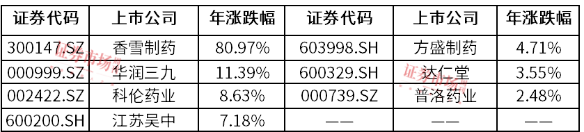 从产业层面回到二级市场投资,在抗癌分类中共包括了35家内地的上市公司,截至8月6日收盘,年内至今仅有七家公司录得股价上涨,占比恰好为20%,它们分别是香雪制药、华润三九、科伦药业、江苏吴中、方盛制药、达仁堂、普洛药业。