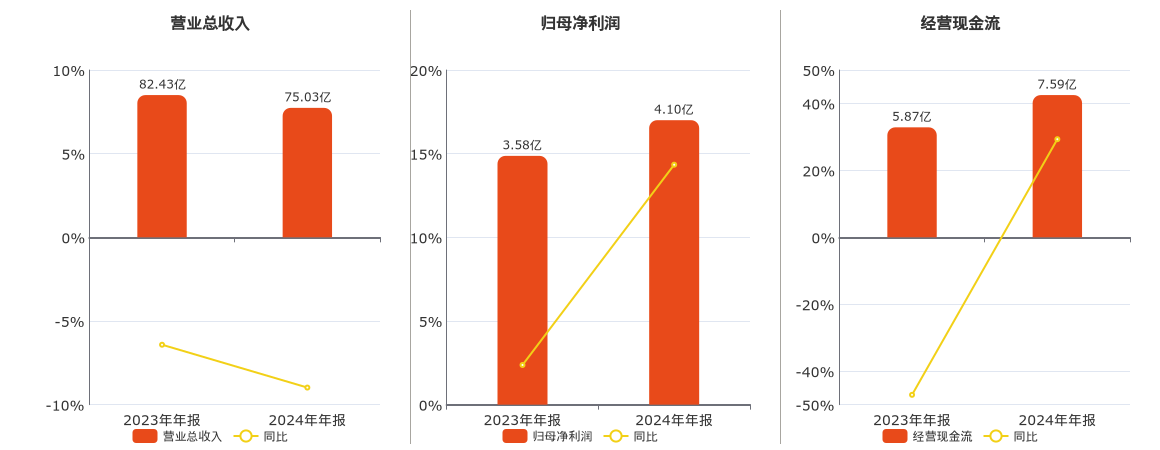 公司营业总收入为75.03亿元,较去年同报告期营业总收入减少7.41亿元,同比较去年同期下降8.98%。归母净利润为4.10亿元。经营活动现金净流入为7.59亿元。