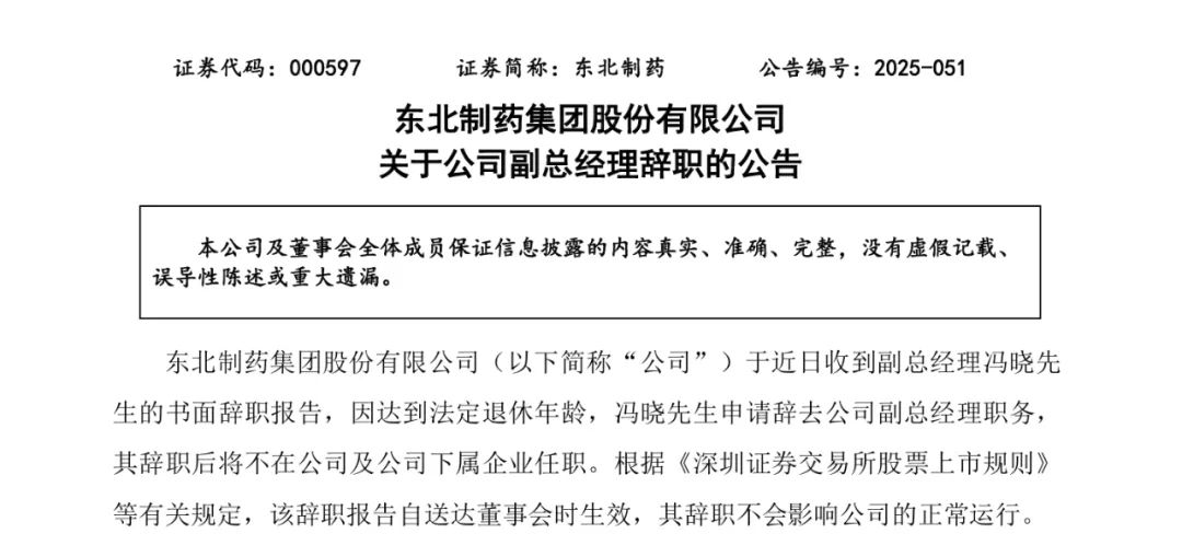 2025年7月3日,东北制药集团股份有限公司发布公告称,公司副总经理冯晓先生因达到法定退休年龄,向公司董事会提交了书面辞职报告,申请辞去副总经理职务,辞职后将不在公司及下属企业任职。根据相关规定,该辞职自报告送达董事会时生效,且其辞职不会影响公司的正常运行。