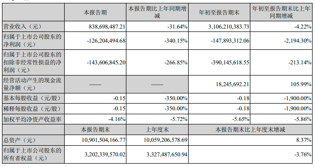 10月26日,青岛双星(SZ000599)公告,第三季度营业收入约8.39亿元,比上年同期减少31.64%%,归属于上市公司股东的净利润约-1.26亿元,比上年同期减少340.15%,归属于上市公司股东的扣除非经常性损益的净利润约-1.44亿元,比上年同期减少266.85%,基本每股收益约-0.15元/股,比上年同期减少350%,总资产约109.02亿元,比上年同期增加8.37%。