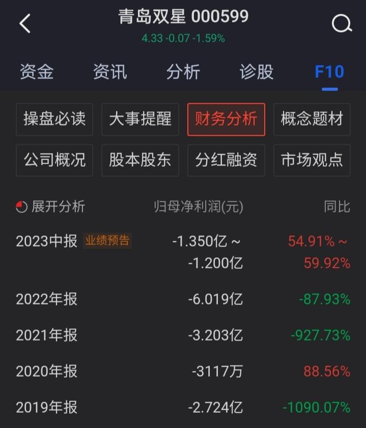 目前,青岛双星还未正式披露2023年半年报。7月15日,公司发布的2023年半年度业绩预告显示,公司今年上半年预计亏损1.20亿元至1.35亿元,但相比于去年同期亏损2.99亿元,今年上半年业绩已有所改善。