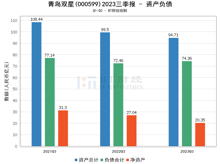 财务数据显示,截至2023年三季度末,青岛双星的总资产为94.71亿元,相较于上年度末的98.63亿元有所下降。负债合计为74.36亿元,略低于上年度末的74.8亿元。净资产为20.35亿元,较上年度末的23.83亿元减少。资产负债率为78.51%,相比上年度末的75.84%有所上升。这些变化反映出公司在资产和负债管理上的微妙调整,以及面对市场挑战时的财务策略。