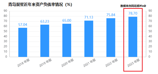 同时,青岛双星2023年资产负债率同比增长近3个百分点,上涨至78.7%。