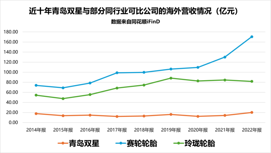 市场方面,近年来海外市场成为新的竞争点,但从数据来看,青岛双星海外销售与竞手企业的差距也非常大。