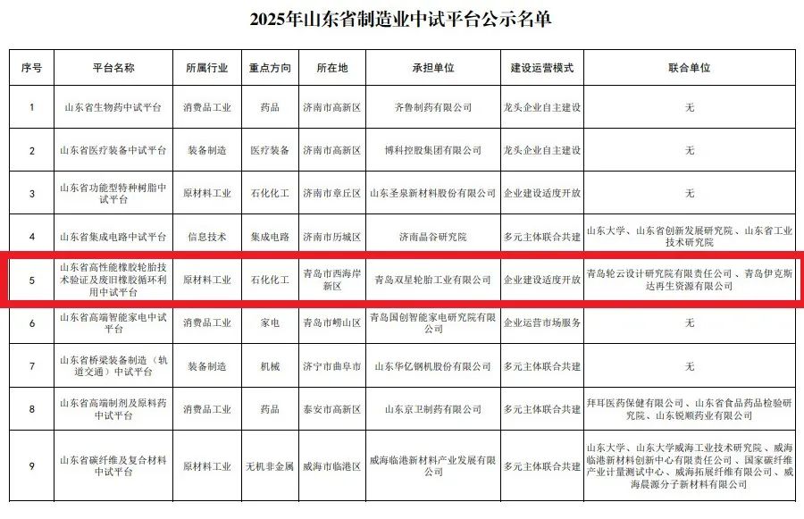 近日,山东省工业和信息化厅公布了2025年山东省制造业中试平台名单,青岛双星轮胎工业有限公司的“山东省高性能橡胶轮胎技术验证及废旧橡胶循环利用中试平台”成功入选。这一殊荣标志着青岛双星在轮胎技术研发和废旧橡胶循环利用领域迈出了重要一步,也为其在行业内的领先地位增添了有力砝码。