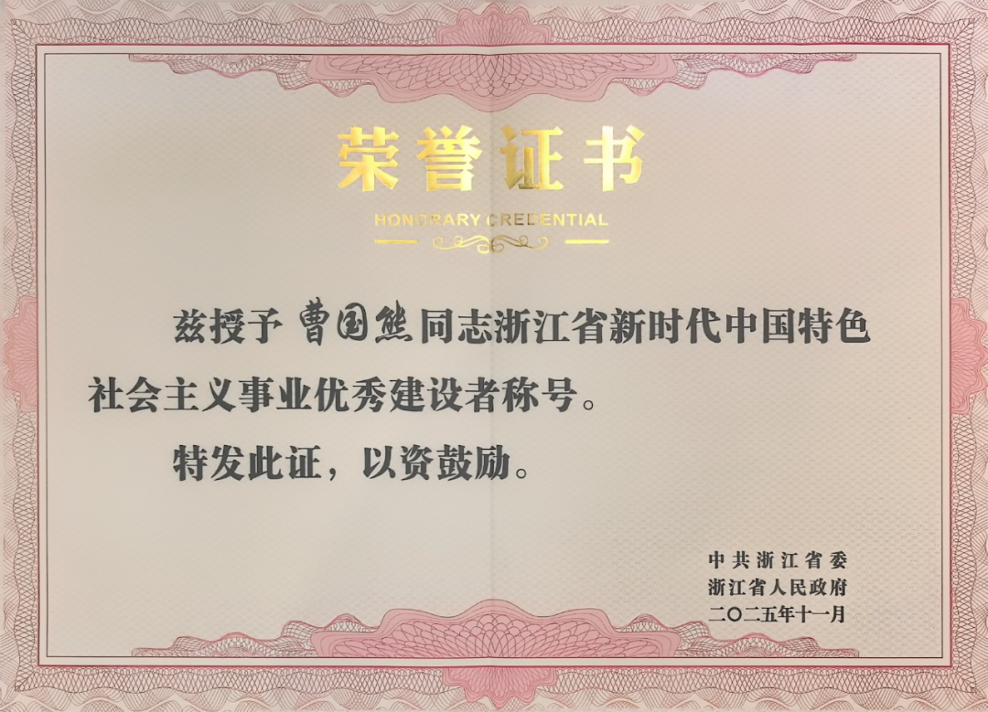 “浙江省新时代中国特色社会主义事业优秀建设者”是民营经济大省浙江在非公有制经济领域设立的最高荣誉之一。该表彰经党和国家功勋荣誉表彰工作委员会办公室审批同意,以浙江省委、省政府的名义开展,前期评选由省委统战部、省经信厅、省人力社保厅、省市场监管局、省工商联联合开展。